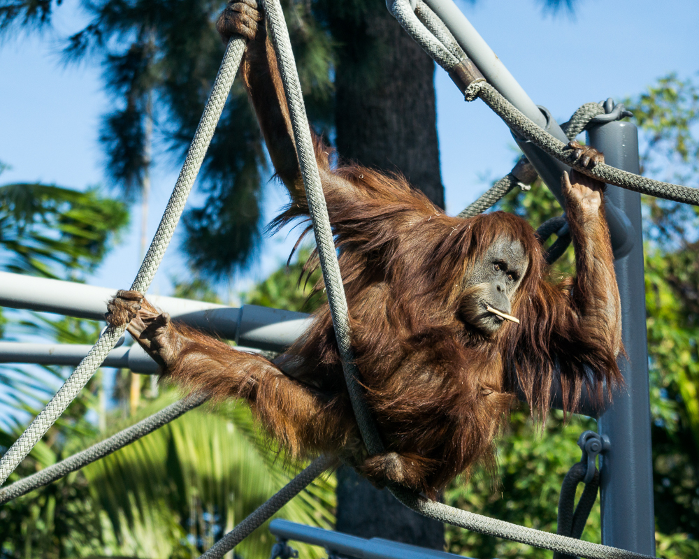 Go on an overcast day. This seems counter-intuitive, especially if you are not a photographer or just started. You would think that it would be best to have a lot of light and a bright blue sky. But too much light washes out the animal fur and can create some very stark shadows given the nature of the obstacles in the habitat. I found this was true with most of my shots of the orangutans. Sometimes I would get a great expression, but there would be a huge shadow caused by their hands or some other element across their faces.